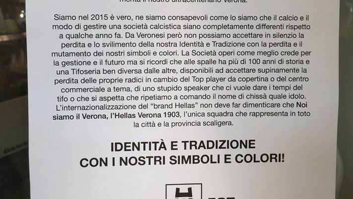 Riporta il testo, tra l'altro: "Siamo nel 2015, è vero, ne siamo consapevoli come lo siamo che il modo di gestire una società calcistica sia completamente differenti rispetto a qualche anno fa. Da Veronesi però non possiamo accettare in silenzio la perdita e lo svilimento della nostra identità e Tradizione con la perdita e il mutamento dei nostri simboli e colori".