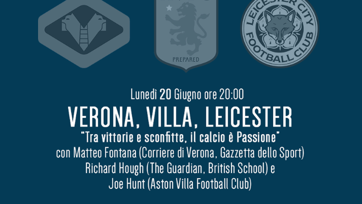 Si parla di pallone, si parla di identità. Si parla di Hellas. E non solo: il confronto si allargherà verso il Leicester City e l'Aston Villa. A intervenire all'incontro, intitolato "Tra vittorie e sconfitte: il calcio e passione", saranno Matteo Fontana del "Corriere di Verona", corrispondente locale per "La Gazzetta dello Sport" e coordinatore di redazione del nostro sito, Richard Hough, collaboratore di "The Guardian", e Joe Hunt, responsabile dell'Academy dell'Aston Villa.