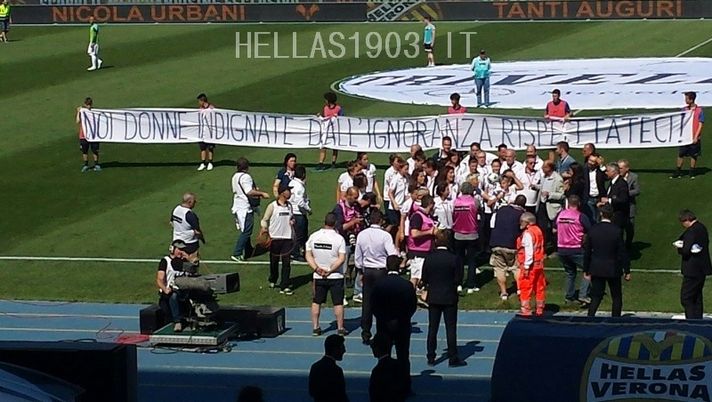 Rosella Sensi consegna loro il premio per la vittoria del campionato, le calciatrici ricevono il caloroso applauso del Bentegodi e dietro a loro compare un grande striscione: "NOI DONNE INDIGNATE DALL'IGNORANZA. RISPETTATECI!".