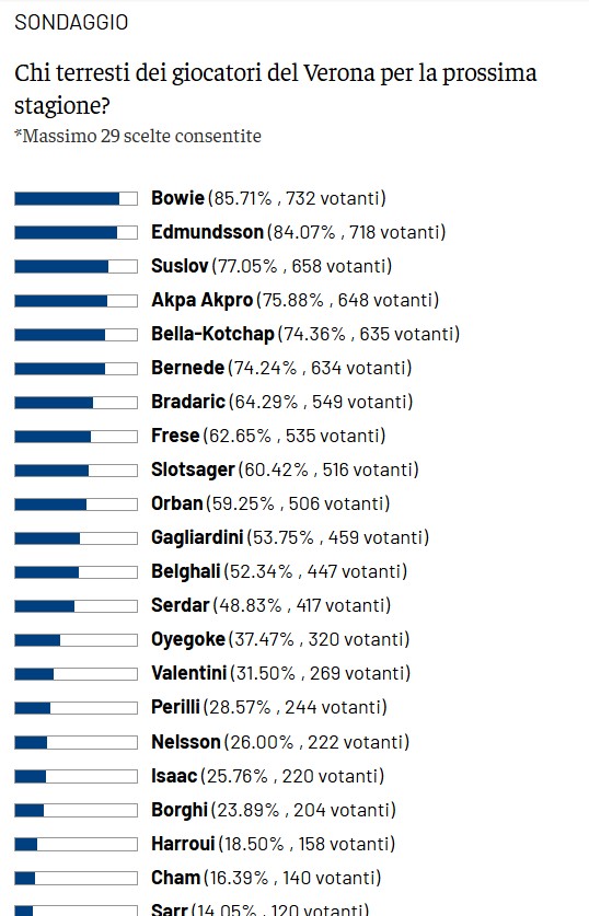 Risultati netti per il sondaggio "Chi terresti del Verona per la prossima stagione?" proposto da hellas1903.it, dove a vincere è Kieron Bowie con l'85,71% di gradimento, seguito da Edmundsson con l'84,07. Terzo posto per Suslov (77,05%), poi Akpa Akpro, Bella-Kotchap e Bernede, seguiti da Bradaric, Frese, Slotsager e Orban.