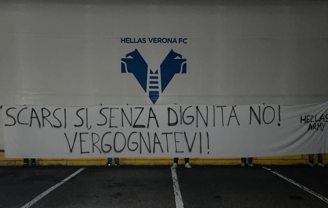 "Scarsi sì, senza dignità, no! Vergognatevi!". Questa la scritta su uno striscione firmato da Hellas Army appeso nella notte sul cancello della sede del Verona di via Olanda.