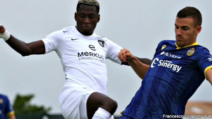 Valerio Verre, autore del gol dell'Hellas nell'amichevole persa con l'Olimpija Lubiana, parla dopo la gara con gli sloveni, a Garda.