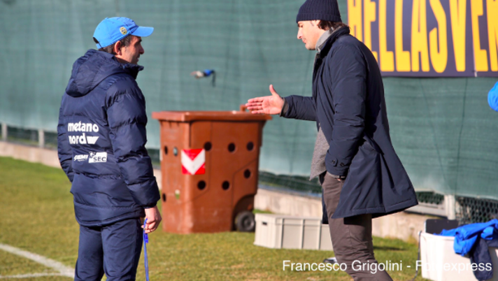 Vanoli, a Peschiera, ha seguito la seduta della squadra di Fabio Pecchia, scambiando poi idee e opinioni con l'attuale allenatore dell'Hellas (foto Grigolini-Fotoexpress).